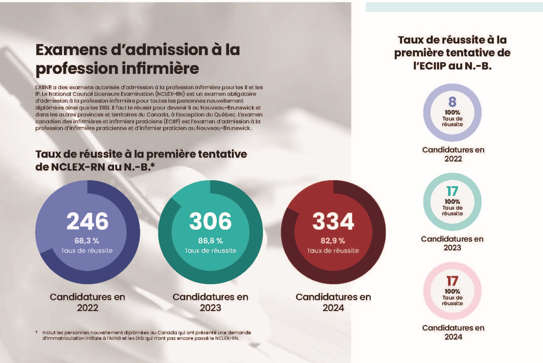 À partir de 2026, toute personne qui demande l’immatriculation à titre d’infirmière praticienne (IP) devra réussir un seul examen national qui remplacera les examens actuels : pédiatrie, pour adultes, famille/tous âge. À l’heure actuelle, la formation des IP au Nouveau-Brunswick prépare les candidats et les candidates à l’examen « famille/tous âges ». L’Examen Canadien d’Admission des Infirmières Praticiennes (ECAIIP) a été récemment créé et est offert aux candidates au titre d’infirmière praticienne au Nouveau-Brunswick. Nous publierons toute nouvelle à cet égard au fur et à mesure sur notre site Web.